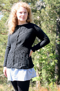 Ainoastaan pisaraidea on varastettu, muu on omasta päästä keksitty. Lisäykset kaarrokkeessa ja helmaosassa on tehty spiraalina (näkyy lähikuvassa). Helma ja hihansuut ovat tehty ainaoikeana, jotta ne olisivat mahdollisimman huomaamattomat.